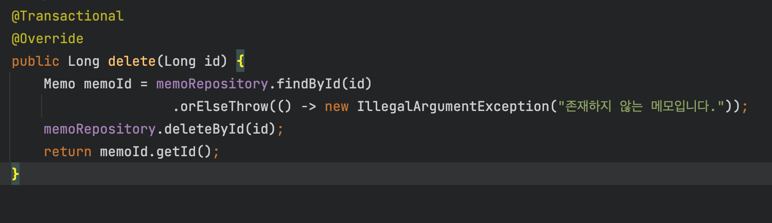 원래 예외처리는 @RestControllerAdvice를 써서 그 안에 @ExceptionHandler메서드들을 모아놓는 방법 등 확실하게 처리를 해야하지만, 워낙 간단한 CRUD기에.. 간단히 id체크하는 예외만 처리하도록 하겠다.