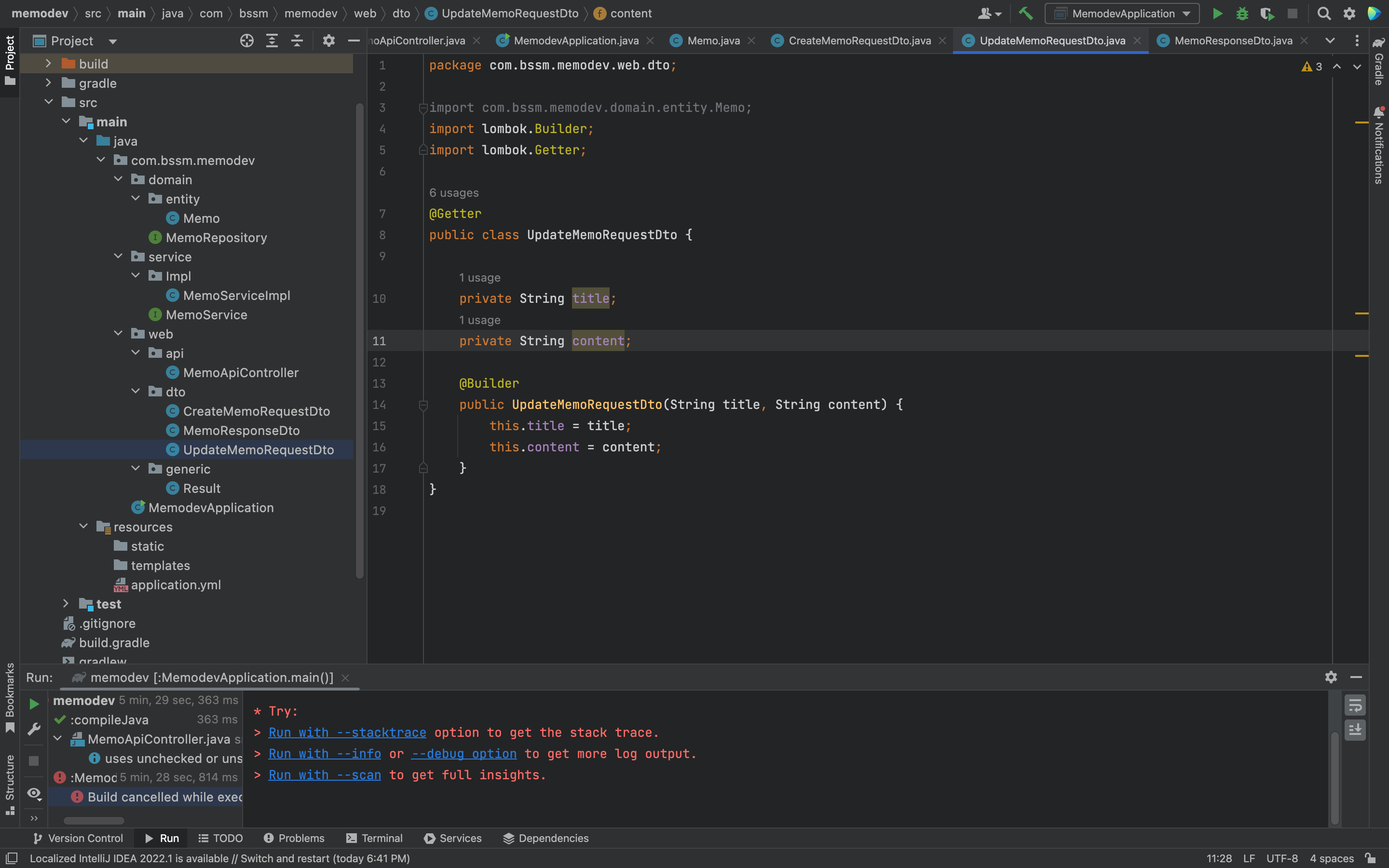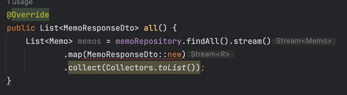 빨간줄을 지우기 위해 MemoResponseDto의 코드를 살짝 변경해 주겠다.