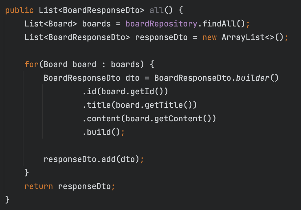 아래는 DB에 저장된 게시글을 다 꺼내서 List로 조회하는 로직이다.